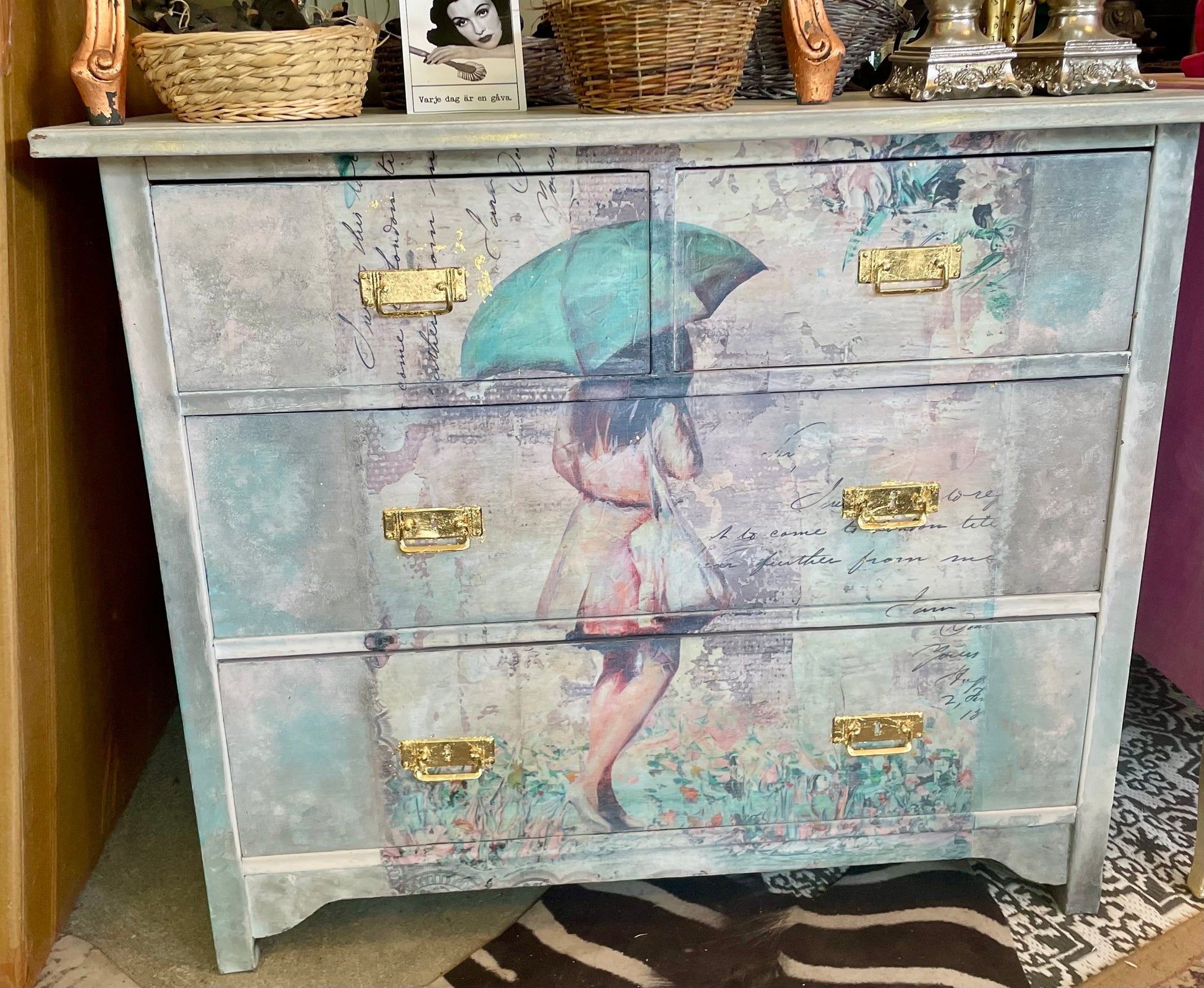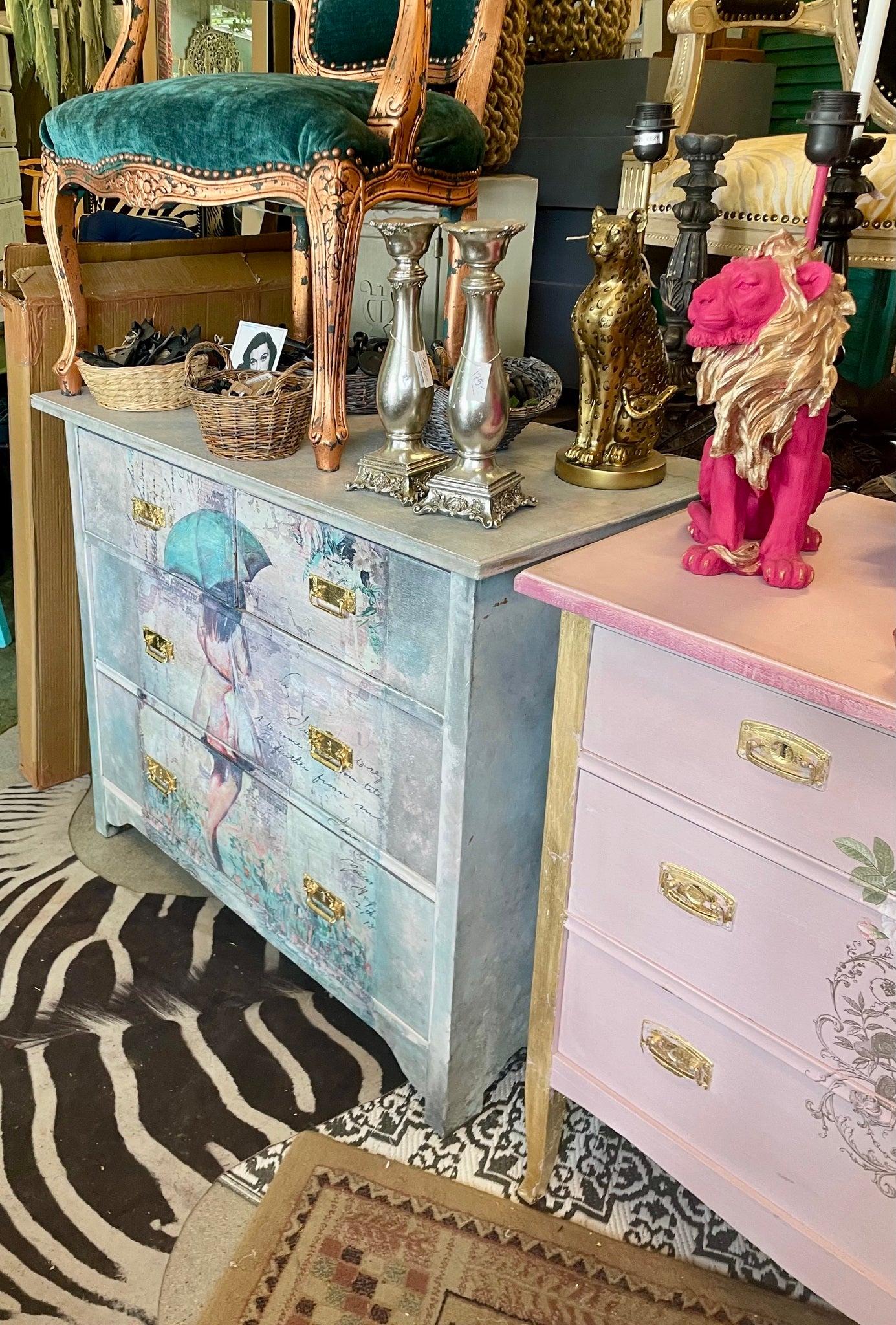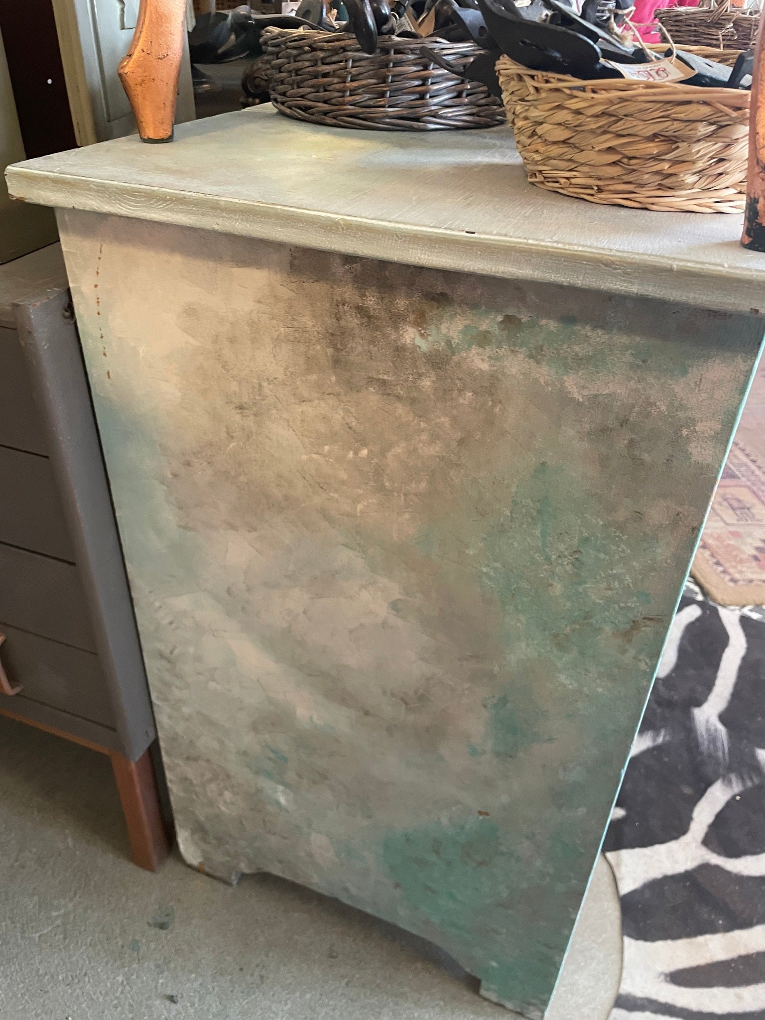 Målad i blå / grå nyans med Annie Sloan chalkpaint och sedan försluten med ett vitt vax.